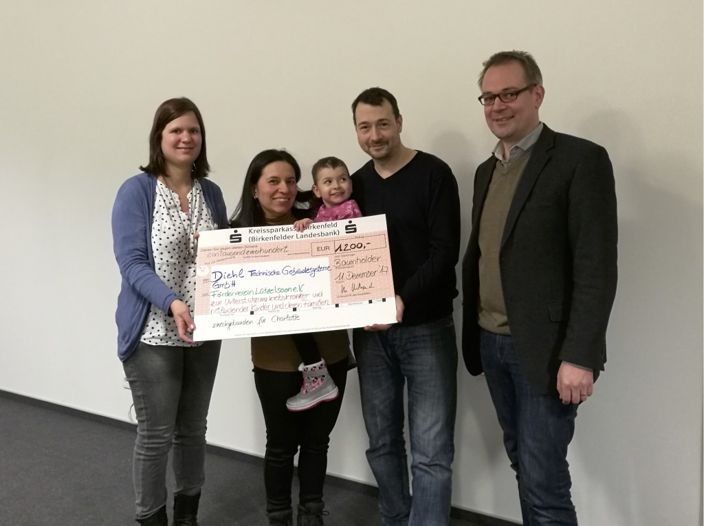 Mike Wirthensohn, Geschäftsführer der Firma Diehl GmbH – Technische Gebäudesysteme, und Nadine Hess übergaben an Isabell Lauf vom Förderverein Lützelsoon zur Unterstützung krebskranker und notleidender Kinder und deren Familien e.V. die Spende über 1.200 Euro zweckgebunden für die dreijährige Charlotte und ihre Familie, die bei der Übergabe ebenfalls anwesend waren.