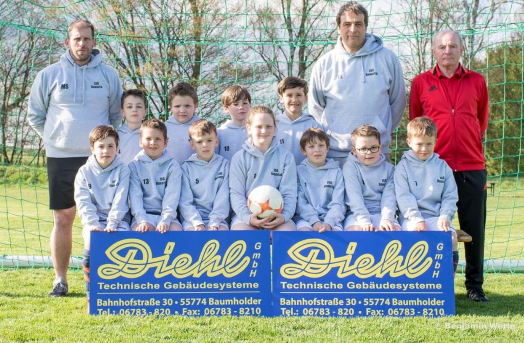 Diehl hat für die F-Jugend der JSG Unnertal einen neuen Satz Kapuzenpullover gesponsert, den sie zusammen mit den Trainern Manuel Schwob, Jens Krieger und dem Jugendleiter Gerd Sohni stolz präsentieren.